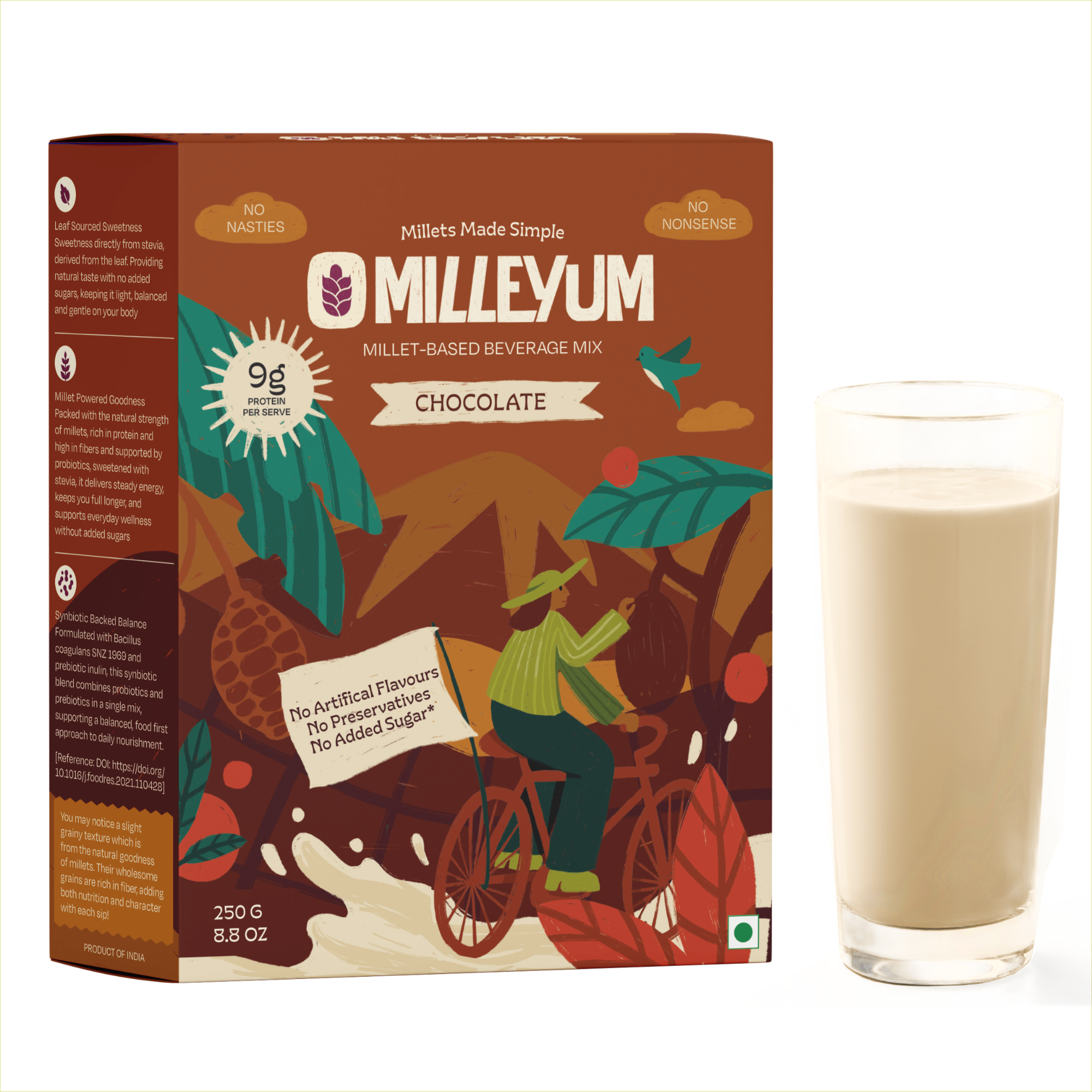 Milleyum Chocolate Millet Drink Mix, a healthy protein rich millet beverage with 9g protein per serving. No added sugar, high fiber, probiotic drink for gut health and sustained energy.